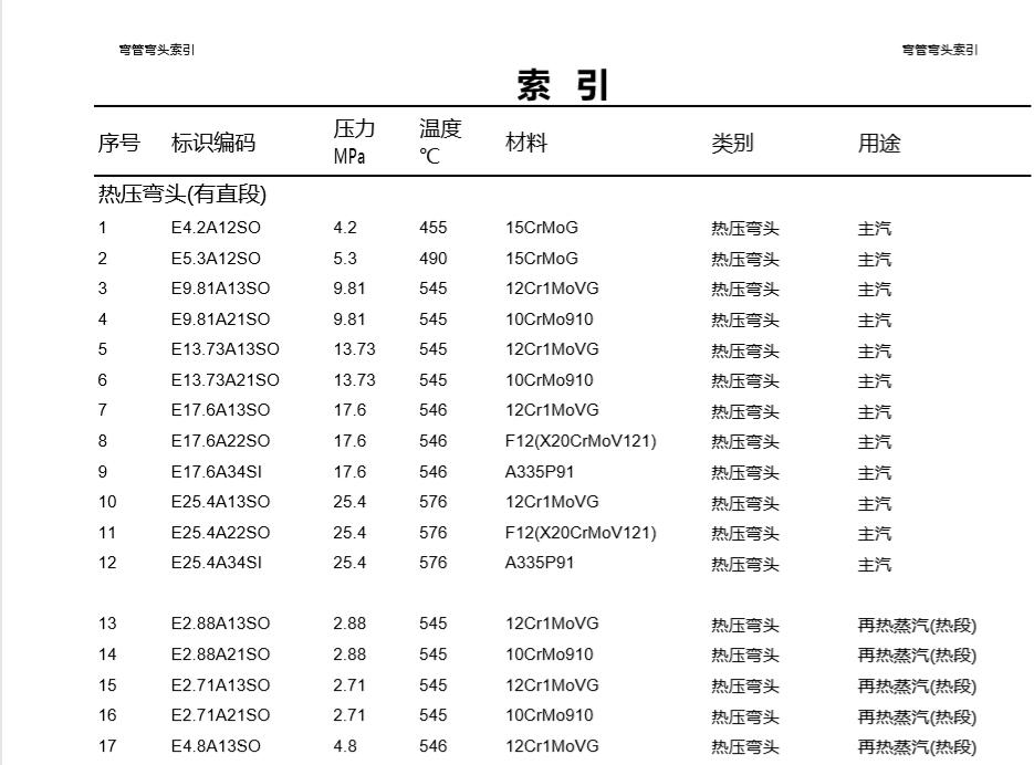 就是說不能超過455度。下面是它的一個(gè)材質(zhì),15crmog。是這樣的一個(gè)合金的材質(zhì),它的類別就是屬于熱壓彎頭。然后它的用途就是主要汽水管道。就是蒸汽或者流水的管道。而不是說這里邊走北冰洋汽水的,或者走那個(gè)西安的那種冰封汽水的這種管道,不是那種喝的汽水。再接下來呢,有那種E5.3a12so。意思也就是仿照的這個(gè)這那么走的除去除非呢壓力不一樣,然后溫度不一樣,它的這個(gè)材質(zhì)也是一樣的,后面的類別和用途也都是一樣的。